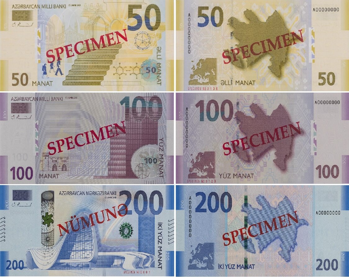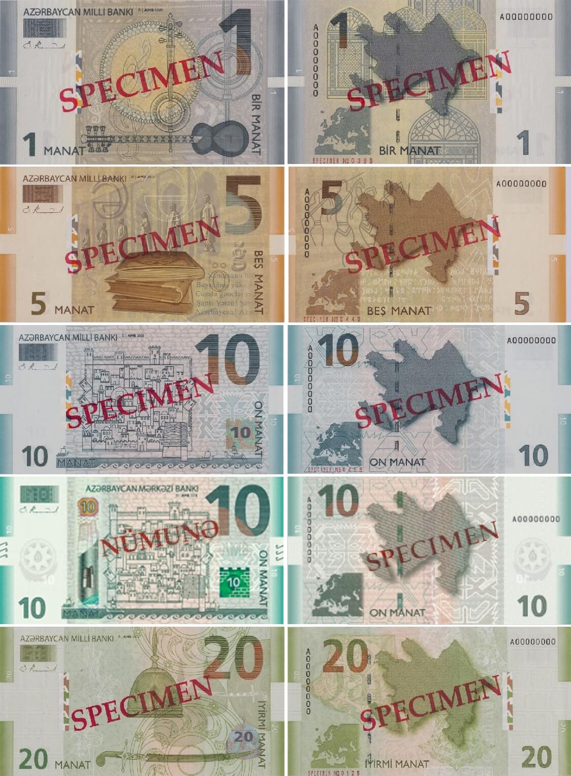 Азербайджанската валута манат прилича на банкнотите евро със сходни размери и цветове. Но всяка банкнота е свързана с различни аспекти от националната идентичност: върху банкнотата от пет маната ще откриете откъс от националния химн, а банкнотите от 20 маната са украсени с меч, щит и шлем, които са символи на властта.За всекидневна употреба са предпочитани банкнотите до 50, а при необходими по-големи суми - те се комбинират с банкноти от 100 и 200.