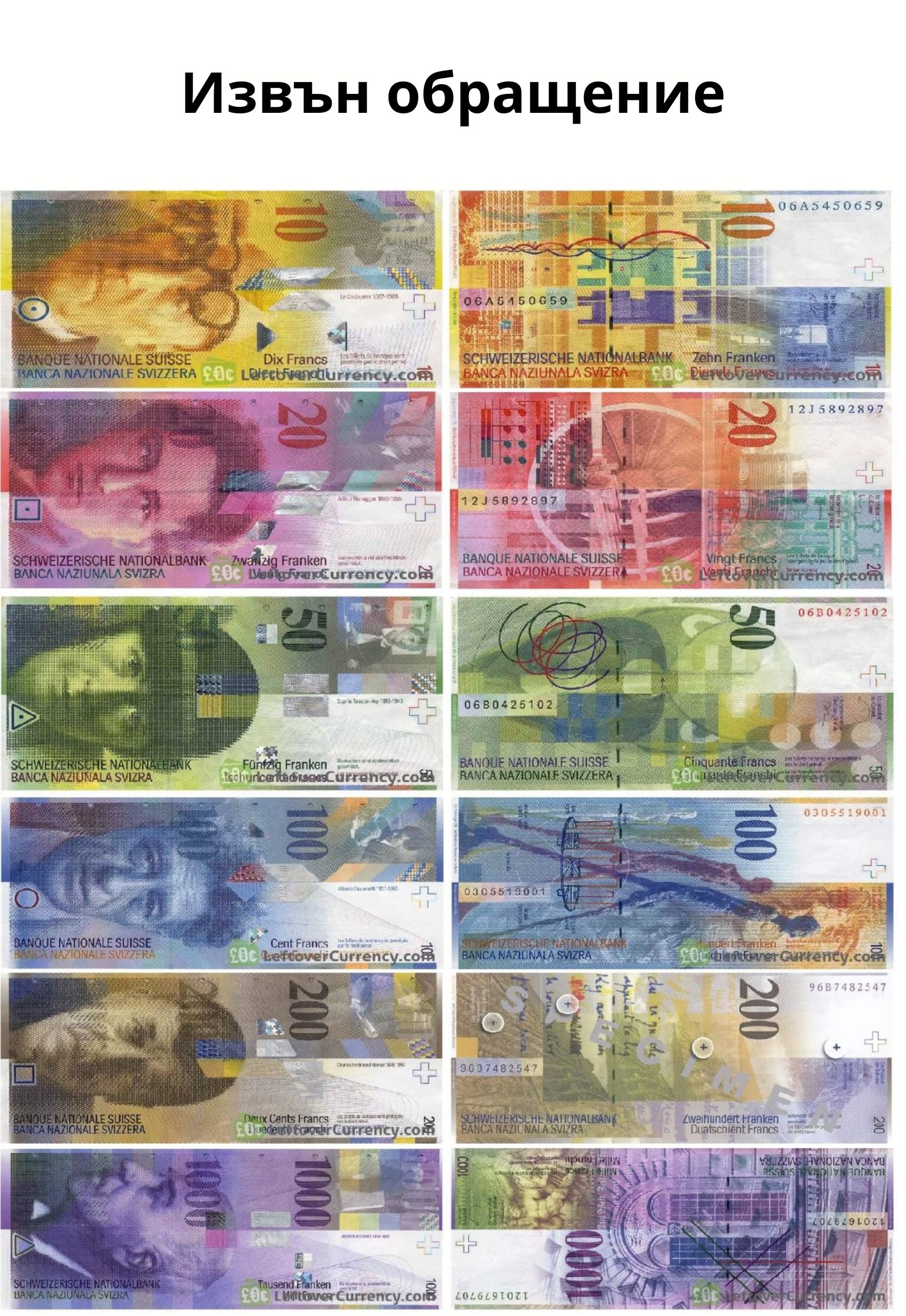 - През 1820-те години Швейцария е разполагала с редица различни валути, издавани от различни банки, които са се конкурирали помежду си. Първите швейцарски банкноти са отпечатани едва през 1907 г.