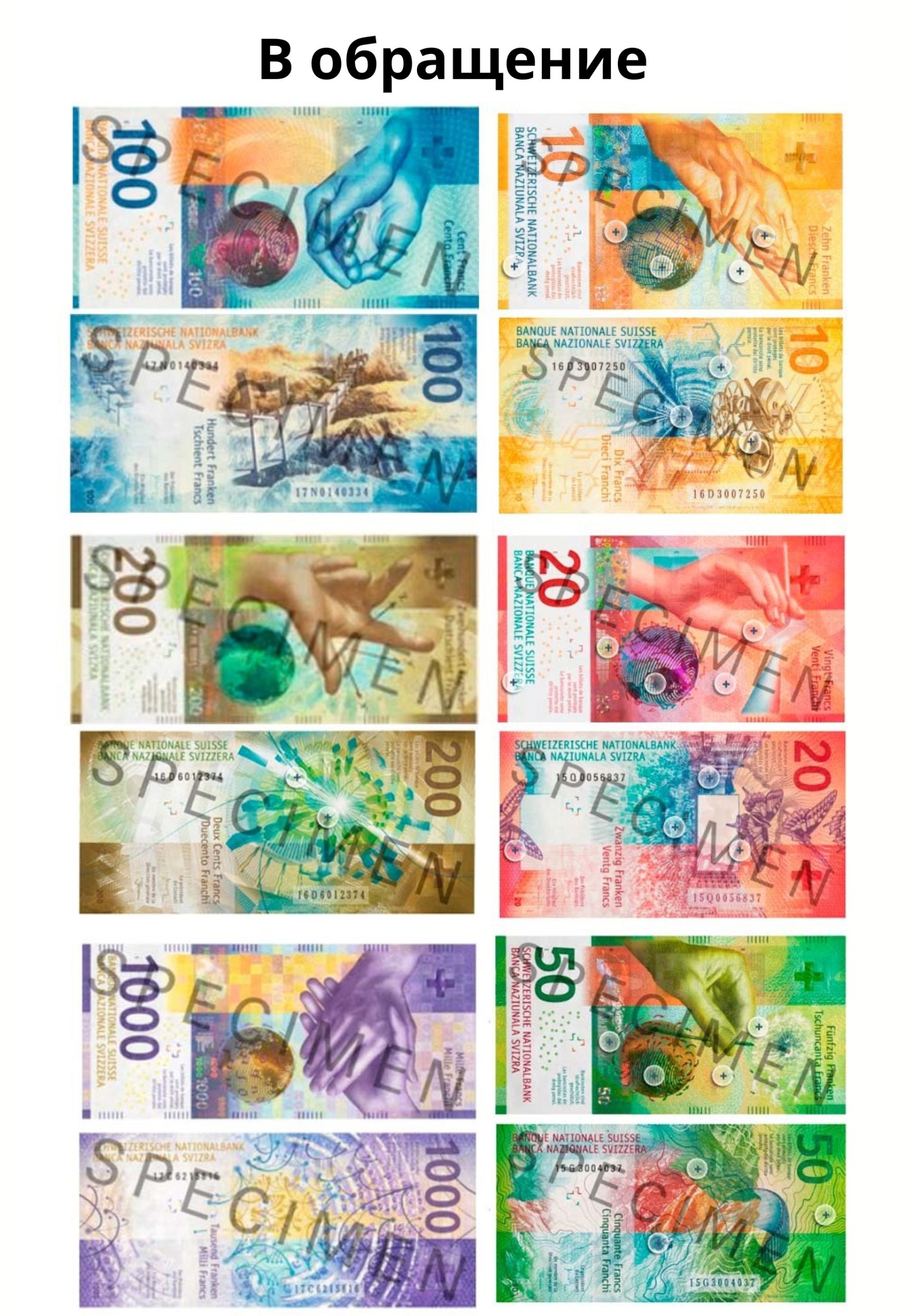 - Деветата поредица от банкноти на Швейцарската национална банка се откроява от стереотипните дизайни на банкноти, които визуализират известни личности. Вместо това към момента те изобразяват швейцарски характеристики като мотиви за новия дизайн. Отличават се с различни елементи като ръка, глобус, отделни местоположения в Швейцария и други различни обекти, които представляват страната.