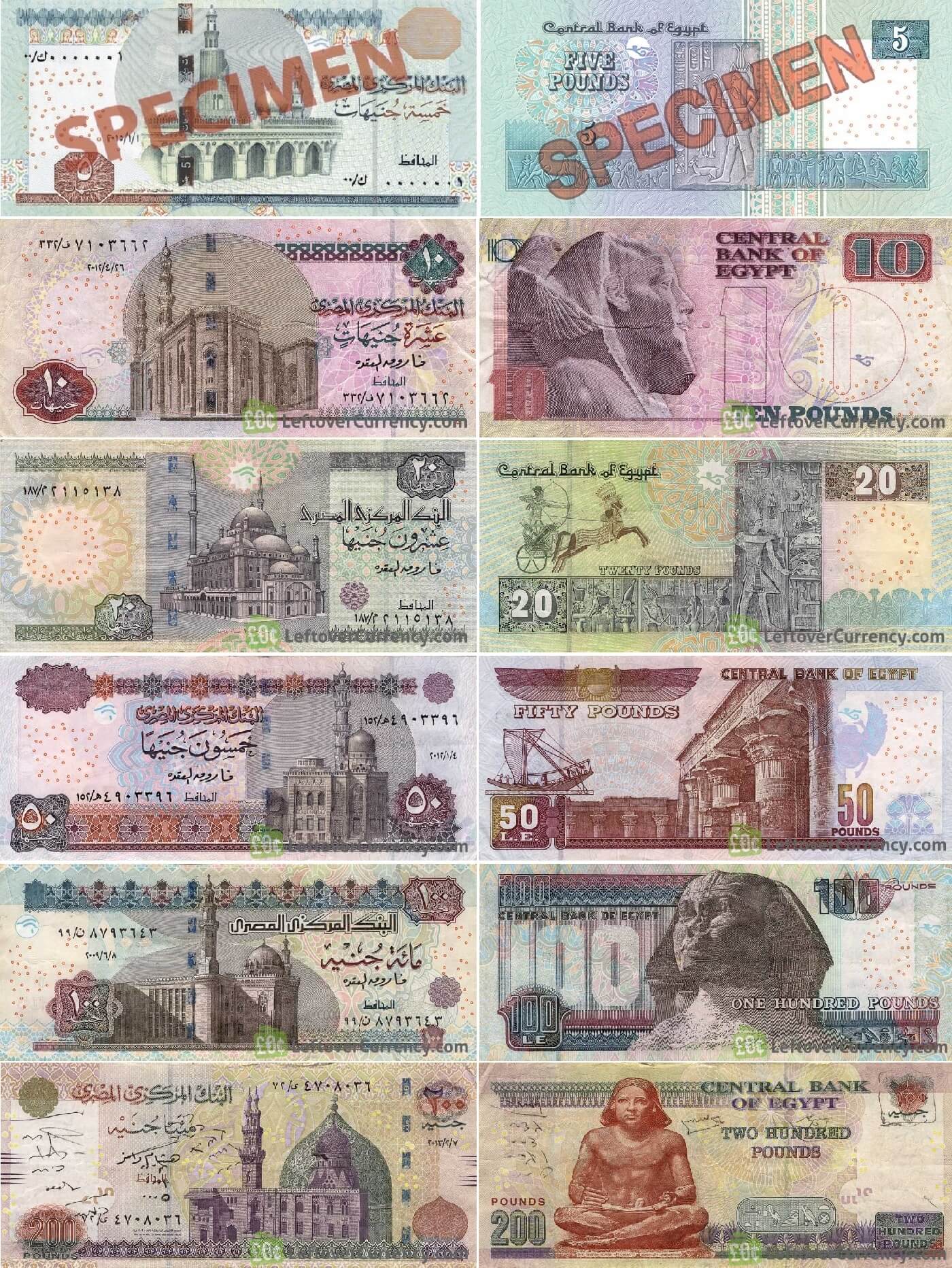 - Официалната валута на Египет е египетският паунд. Кодът на валутата е EGP, а египетско-арабското й име e l-genēh el-maṣri. Символът, използван за EGP, е E £ или на арабски (ج.م). Понякога се съкращава като LE или LE, от френското „libre égyptienne“.