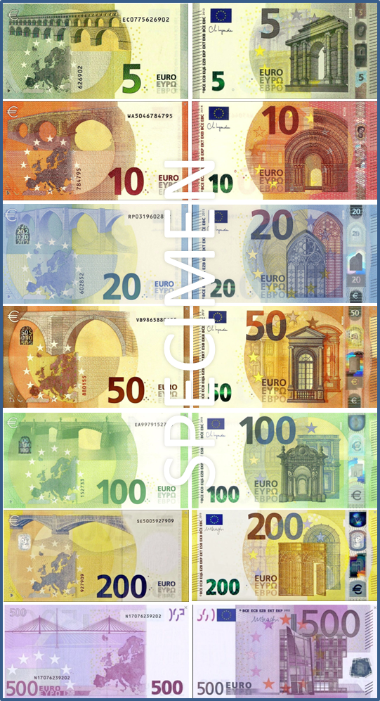 В тази серия евробанкноти инициалите на Европейската централна банка са представени не в пет, а в девет езикови варианта вследствие на разширяването на Европейския съюз през 2004 г. и 2007 г.: BCE ECB ЕЦБ EZB EKP EKT EKB BĊE EBC.