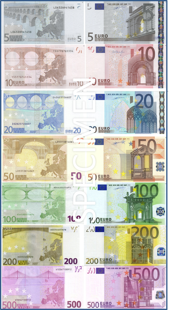 Евробанкнотите от друга страна никога не изобразяват хора или реални места, а само илюстрации от историята на европейската архитектура. Евробанкнотите в употреба са с номинална стойност 5 €, 10 €, 20 €, 50 €, 100 €, 200 € и 500 €.