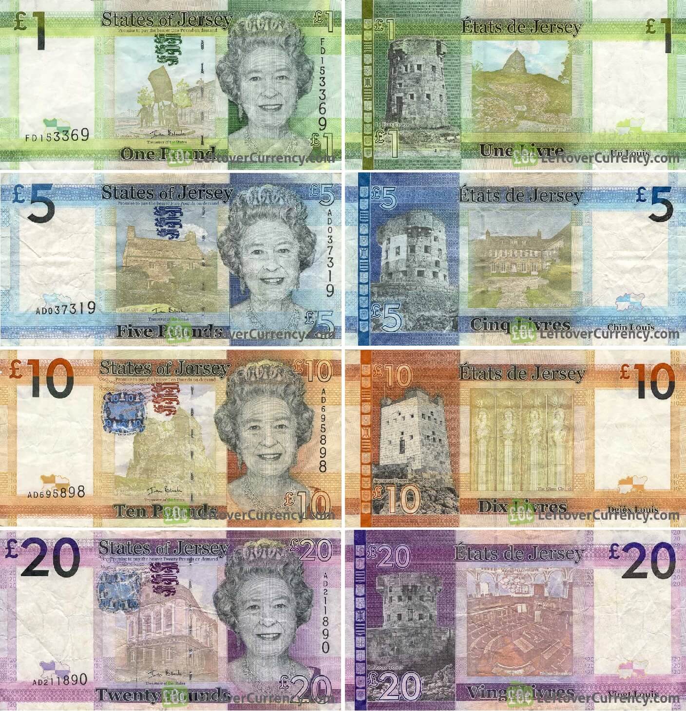 И банкнотите на Джърси, и банкнотите на Английската банка са законно платежно средство в Джърси и се разпространяват заедно, заедно с фурната на Гернси и шотландските банкноти. Бележките от Джърси не са законно платежно средство в Обединеното кралство и за разлика от банкнотите от Шотландия и Северна Ирландия не са разрешени от парламента на Обединеното кралство като законна валута в Обединеното кралство