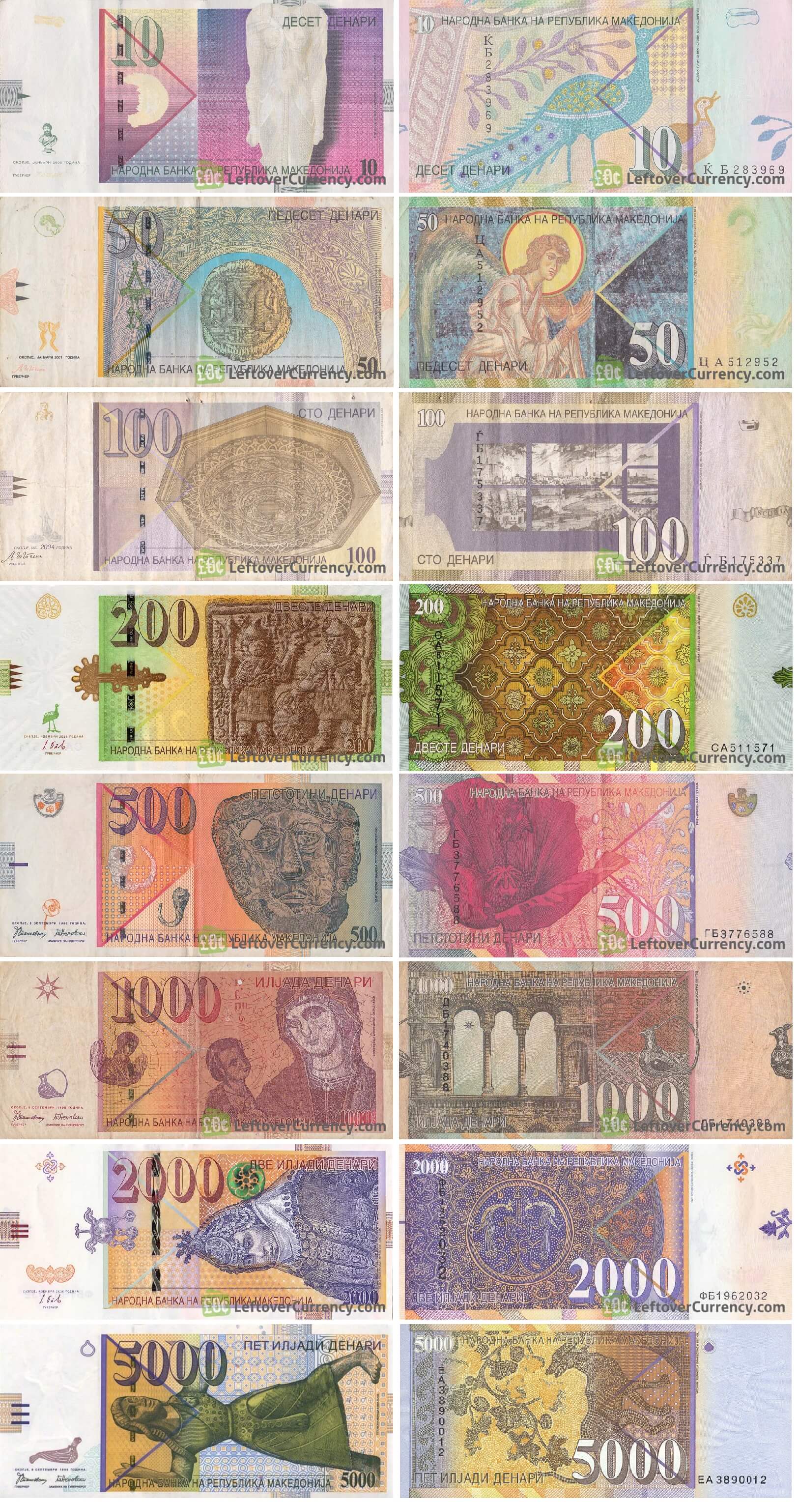 Банкнотите с по-малка деноминация, 10, 50 и 100 денара са печатани в Република Македония, докато банкнотите с деноминации от 500, 1000 и 5000 денара (издание 1996), са печатани в “Thomas De La Rue” Лондон. Последното издание на банкнотите от 500 и 1000 денара от 2003 г. е изработено в TDLR. Македонските банкноти съдържат повече защитни елементи.Най-добре е да се разплащате с местната валута. Ако ще ходите с туристическа цел, за вас по-добре и удобно би било да се снабдите с дребни, тоест с македонски денари с нисък номинал. В случая ви съветваме да имате под ръка банкноти от по 50, 100, 500 и 1000 македонски денара. Ако обаче вашето пътуване има бизнес характер или възнамерявате да правите по-мащабни покупки, ние ви препоръчваме да имате купюри от по 1000 и 5000 македонски денара. ОБЩА ИНФОРМАЦИЯ